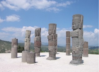 This picture shows Tula, north of the city where these huge statues were erected on a tall pyramid. There are also 2 giant ball courts here.